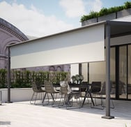 Made to measure, aluminium, wall mounted, electric retractable pergola systems, offering the best rain protection, whilst also having far higher wind resistance ratings over any standard knuckle arm awning. Fabric is deployed from a fully enclosed cassette and is under high tension to provide the very best taught fabric canopy. Some systems use a zipped channel either side for 4 sided tension on the canopy. Most of these systems will extend up to 6000mm in projection whilst able to cover any width by joining together.